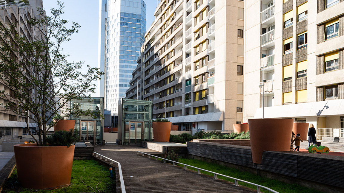 L’aménagement projette la création d’un escalier urbain reliant la rue du Vieux Pont de Sèvres au Mail des Provinces, situé six mètres plus haut, la création d’un ascenseur urbain vitré et d’un massif planté rue Yves Kermen. Les éléments en béton préfabriqués sont remplacés par une serrurerie à barreaudage qui accompagne la montée de l’escalier permettant d’alléger la façade et d’ouvrir visuellement l’escalier et le quartier depuis la rue. L’ascenseur est quant à lui implanté dans le massif planté créé sur la rue Yves Kermen. Cette volumétrie associée au choix des matériaux permet donc de créer un véritable signal depuis la rue et de consolider la volonté d’ouvrir le quartier sur son environnement.